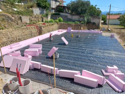 V Hrvatinih so izvajalci pričeli z gradnjo pasivnega dvojčka za prodajo na trgu. S fotografiranjem smo jih ujeli na samem začetku polaganja JUBHome BASE  toplotne izolacije, pri montaži prvih robnih elementov. Sledila bo vgradnja vseh JUBHome sistemov do strehe