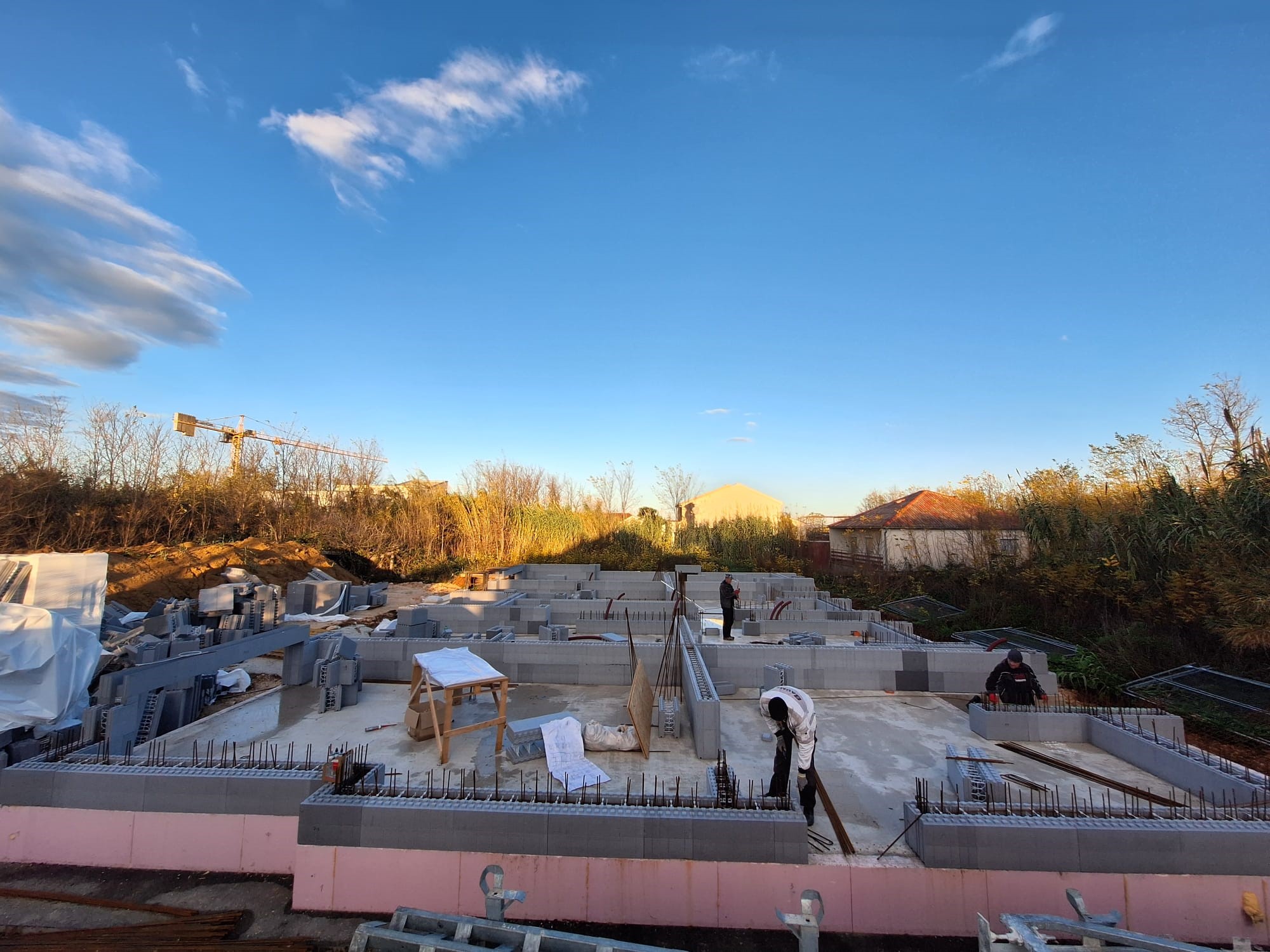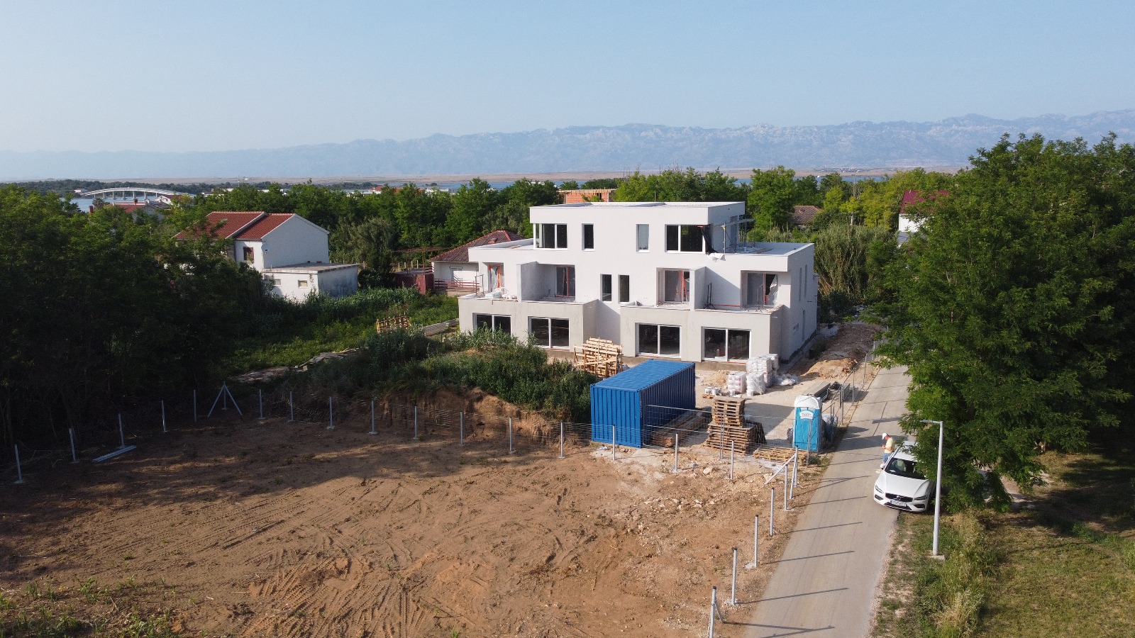 Na hrvaški obali, v kraju Privlaka, poteka obsežen gradbeni projekt, ki vključuje zanimiv objekt s šestimi stanovanjskimi enotami in skupno neto površino 505 m². Investitor je konec lanskega leta izvedel temeljno ploščo in postavil pritličje objekta. Sredi decembra, ko se stvari običajno umirijo, so se dela začasno ustavila, z gradnjo pa se je nadaljevalo sredi januarja. Objekt, kot ga vidite na spodnjih slikah, je zrasel v vsega 3 mesecih. Glede na to, da so v tem času dela zaradi božično novoletnih praznikov dela stala in da je se izvajalec z JUBHome sistemi srečal prvič, je to res zgovoren podatek.